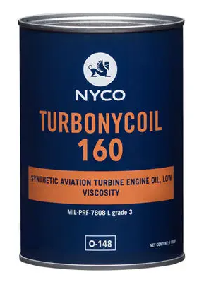 TURBONYCOIL 160 é um óleo de 3 cSt a 100°C feito de ésteres de neopoliol contendo aditivos para melhorar as suas propriedades antioxidantes, anticorrosivas e de extrema pressão. Ele é projetado para suportar as altas temperaturas experimentadas pelos motores de aviões a jato militares e para reter a fluidez em temperaturas muito baixas (operação até -54°C)
